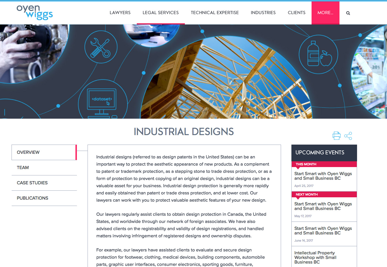 Developed with fSquared Marketing. Rich and detailed custom site for Vancouver-based patent law firm, including full-screen background video and content blocks, and detail-oriented configuration of custom post types and custom data fields.